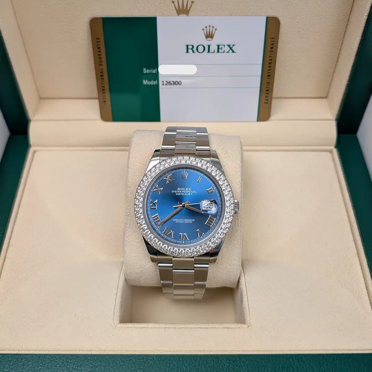 Rolex 126300 41mm Blue Roman Dial Aftermarket Diamond Bezel Oyster Bracelet Watch, Rolex Box, Rolex Card 2019