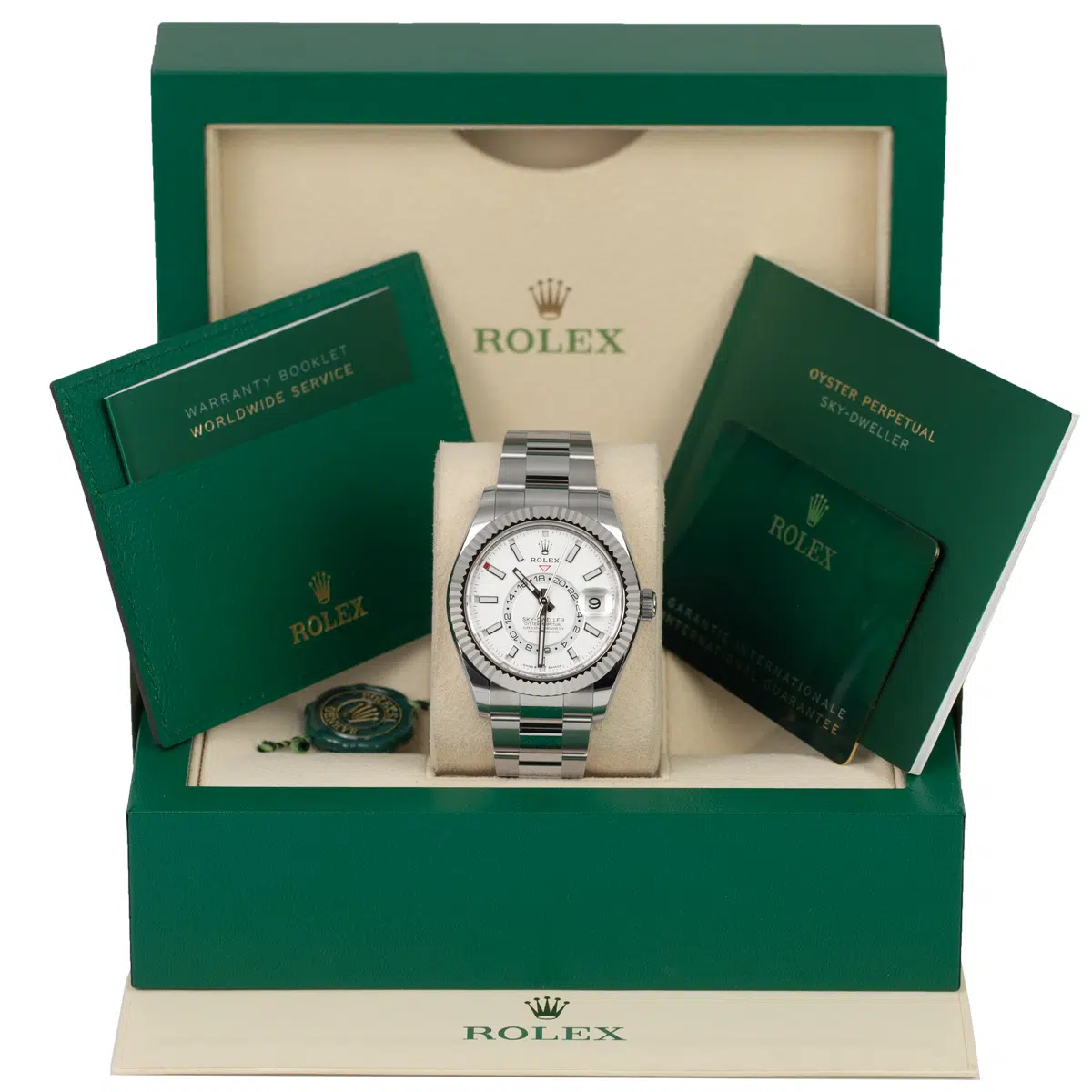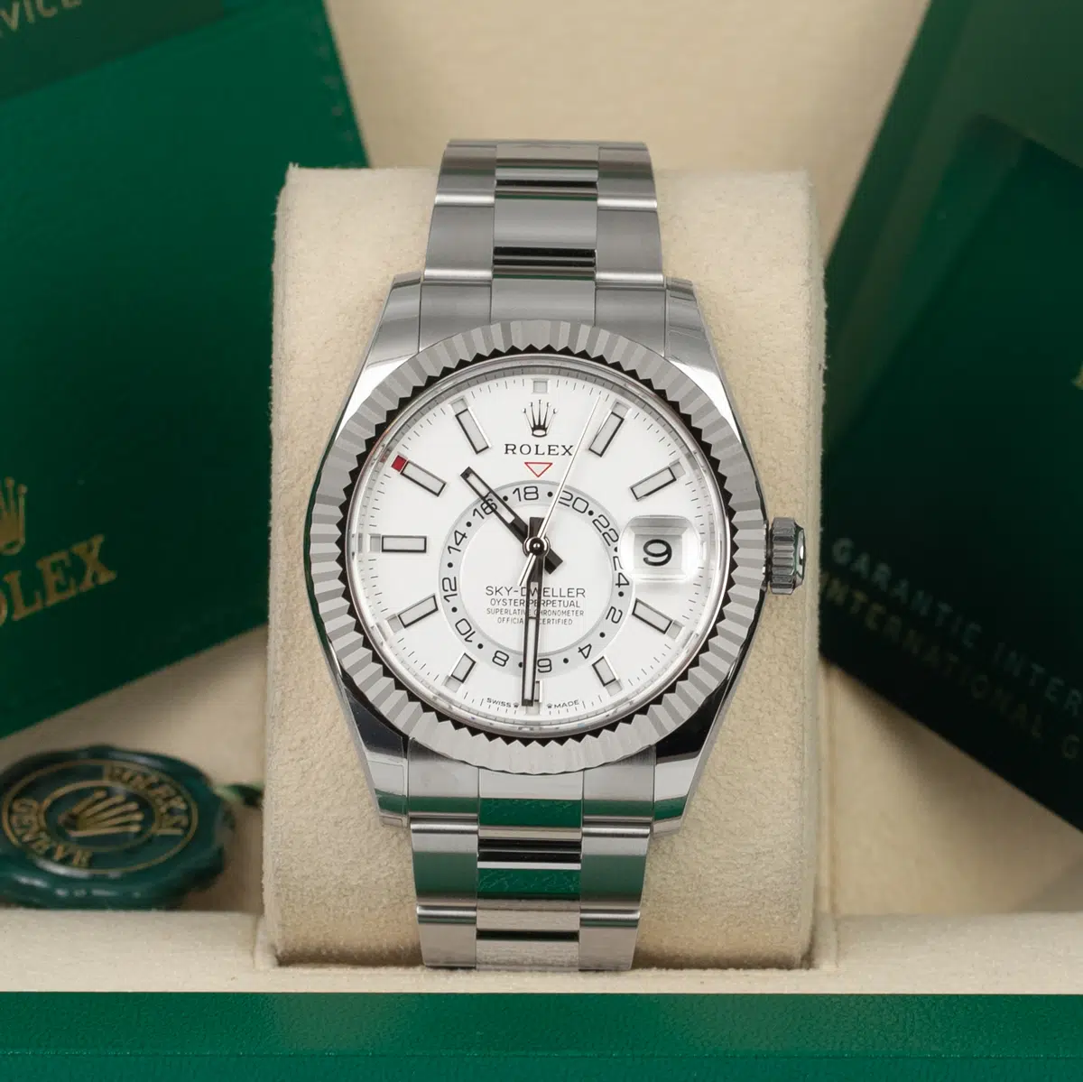 Unworn Rolex Sky-Dweller White Dial Oyster Bracelet Watch, Complete Set (Rolex Box and Rolex Papers 2024)